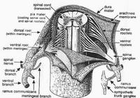 - En el interior del conducto raquideo: aparece la medula dorsal de donde salen los pares dorsales II a XII entre las vertebras D2 a D9 y la medula lumbar donde salen los cuatro primeros pares lumbares correspondientes a las vertebras D10 a D12. Las meninges envuelven a la medula: duramadre, aracnoides y piamadre. El espacio epidural se extiende entre la duramadre y las paredes del conducto raquideo y esta lleno de una almohadilla grasa recorrida por voluminosas venas de los plexos interraquideos formados por cuatro venas, estando en contacto por delante con el ligamento longitudinal posterior y por detras con las laminas y los ligamentos amarillos. A nivel de los agujeros de conjuncion los plexos intrarraquideos se unen con los plexos extrarraquideos mediante las venas de los agujeros de conjuncion.